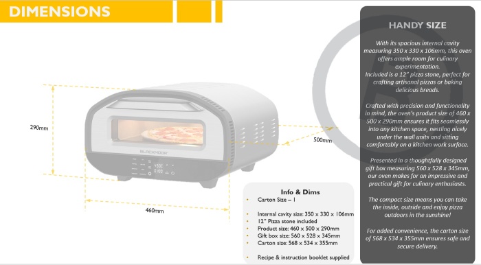 | Additional Features: | 12" PIZZA STONE, 7 PRESET FUNCTIONS, DIGITAL TIMER, INTERNAL CAVITY: 35 X 33 X10CM, SUITABLE FOR 12 INCH PIZZA, TEMP CONTROL: 80-430 DEGREE DIGITAL VARIABLE, TRIPLE INSULATED GLASS DOOR |