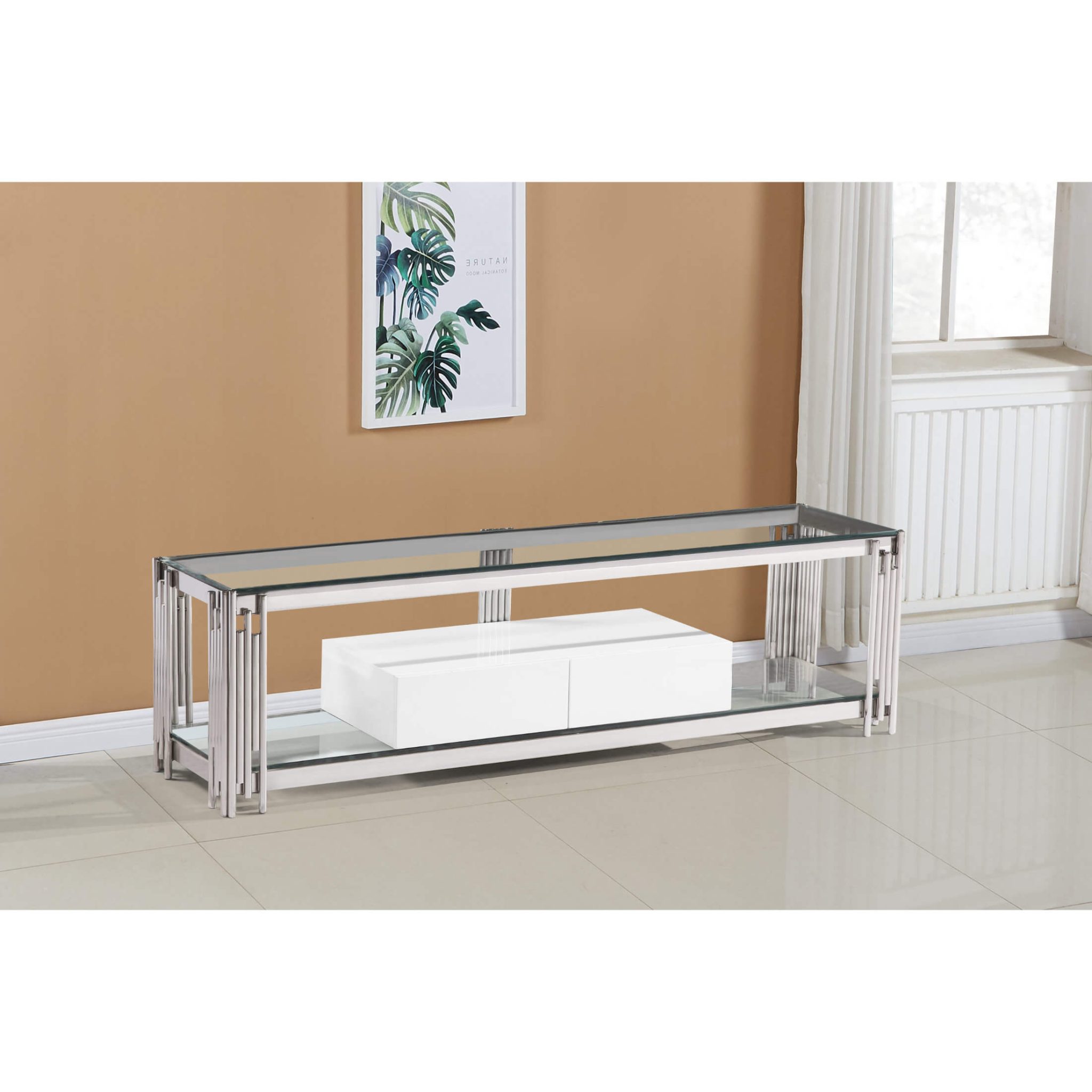 Fulvia TV Unit 1600W x 400D x 450H Clear Glass Top with High Gloss Drawer and Stainless Steel Frame, White & Silver