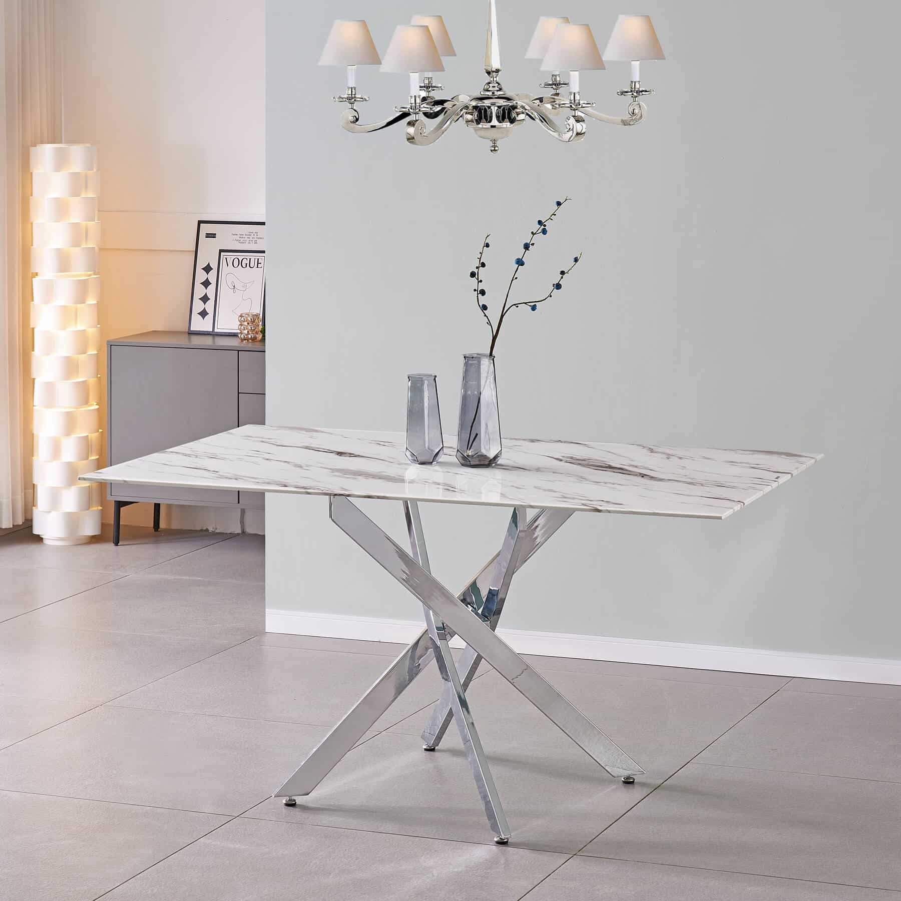 Scimitar Marble Effect Glass Dining Table with Silver Legs, 1600W x 900D x 760H