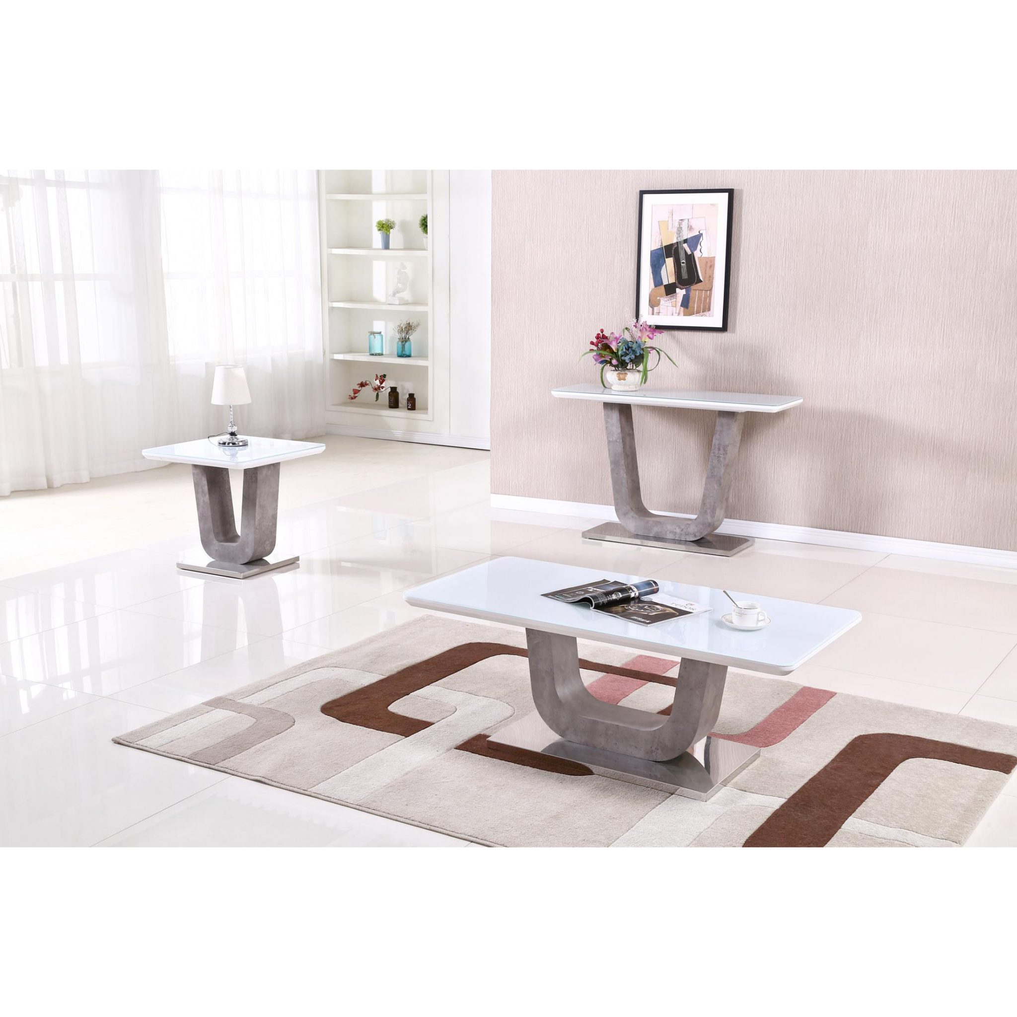 Topaz Console Table 1200W x 400D x 800HHigh Gloss with Tempered Glass Top and Stainless Steel Base, Stone Effect